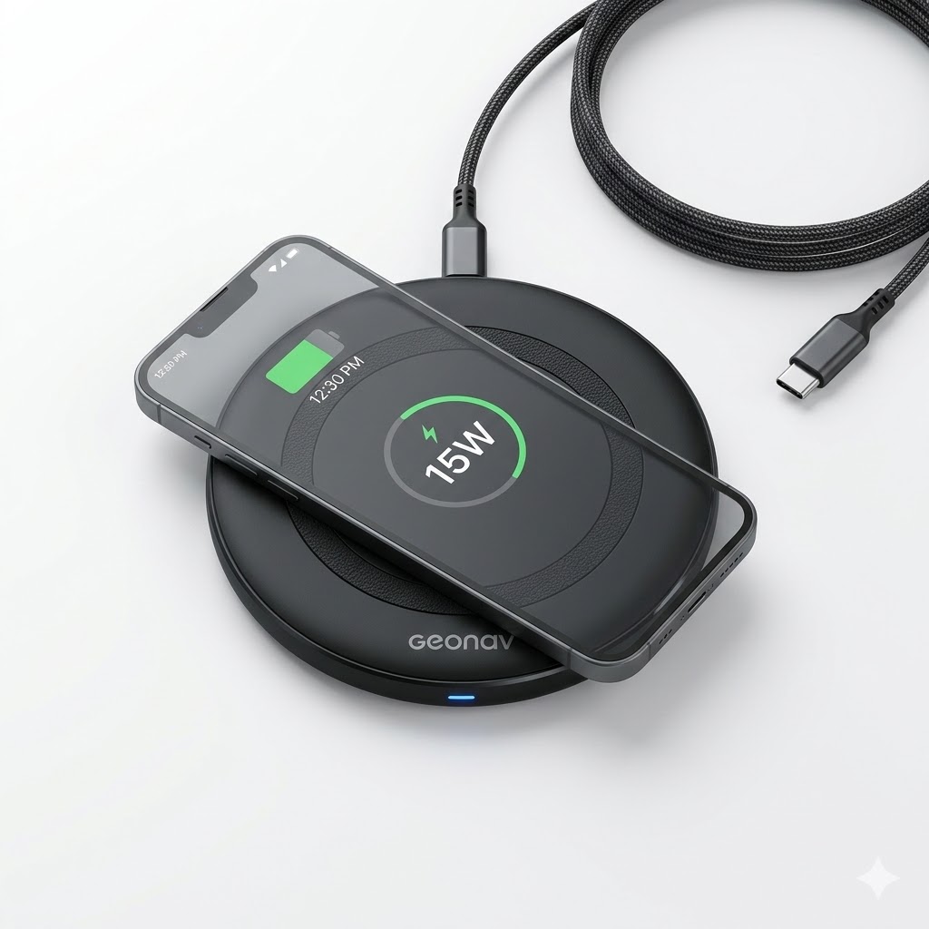 O Carregador por Indução Geonav combina conveniência com alta performance. Utilizando o padrão Qi (universal), ele garante energia para seus dispositivos sem o desgaste de conectar e desconectar cabos diariamente.