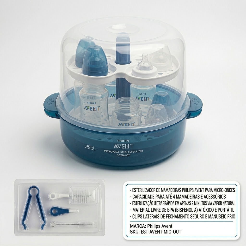 O Esterilizador de Mamadeiras Philips Avent foi desenvolvido para ser rápido, prático e extremamente eficiente. Através do calor do micro-ondas, ele gera vapor intenso que esteriliza o conteúdo sem a necessidade de produtos químicos, sendo seguro para o bebê e para o meio ambiente.